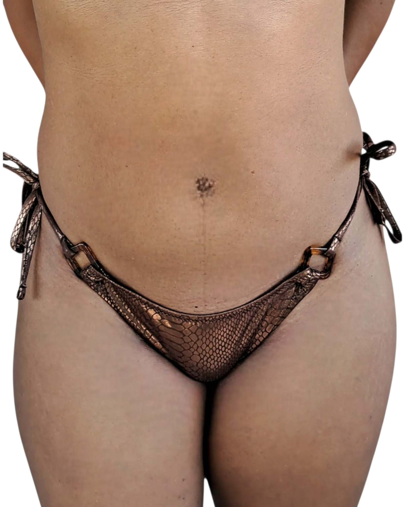 Ce bikini effet bronze avec un motif peau de serpent est l'accessoire parfait pour vos moments de baignades en vacances. Les anneaux décoratifs ajoutent une touche de sophistication, tandis que le motif peau de serpent vous fera vous démarquer à la plage ou à la piscine. Restez tendance avec ce bikini unique en son genre.