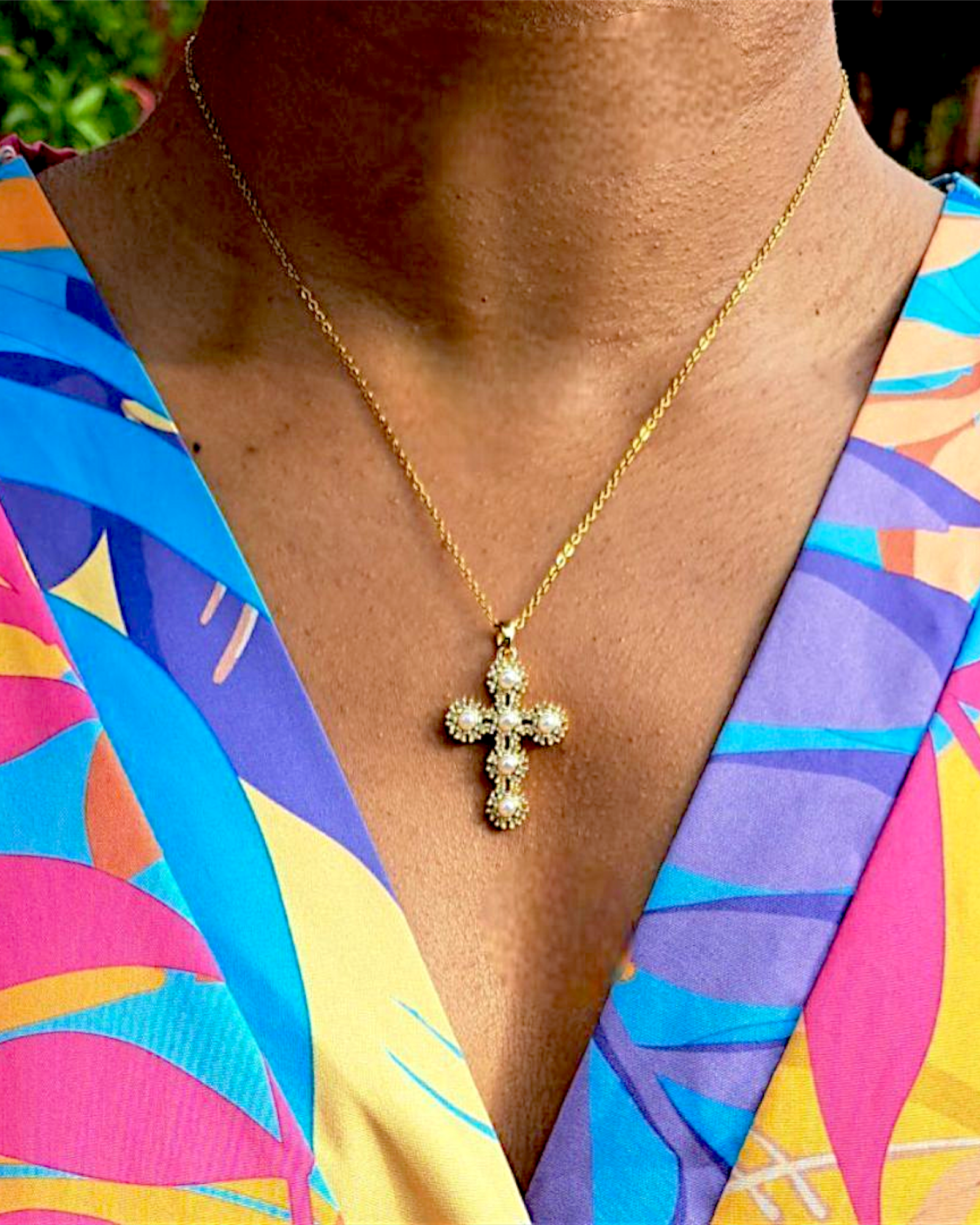 Notre collier croix dorée orné de perles scintillantes ajoutera une touche de raffinement à votre style. Ce bijou intemporel est parfait pour sublimer toutes vos tenues, qu’elles soient chic ou décontractées.