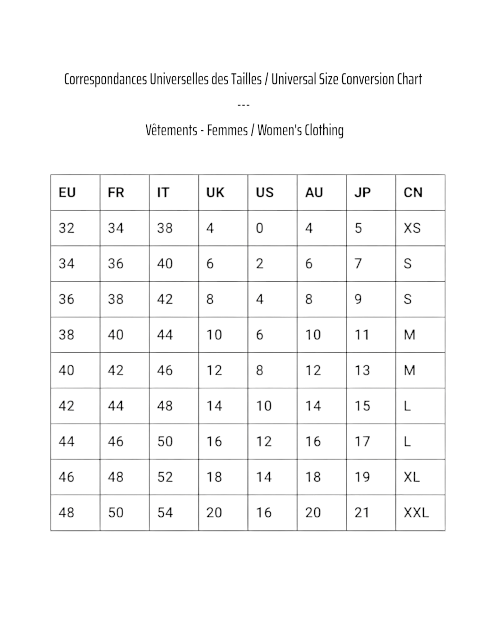 En cas d'hésitation entre deux tailles, nous vous conseillons de prendre la taille au-dessus, spécifiquement pour cet article.