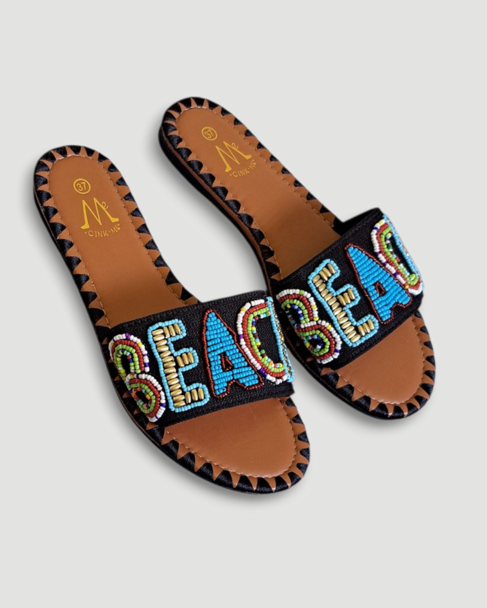 Ces sandales de style "artisanales" sont parfaites pour vos journées ensoleillées à la plage. Dotées d'une semelle intérieure confortable et ornées de perles colorées formant le mot "BEACH", elles combinent style et confort pour un look estival irrésistible. Ces sandales sont fabriquées à avec des matériaux de haute qualité, assurant durabilité et élégance. Parfaites pour ajouter une touche vibrante à votre tenue de plage!